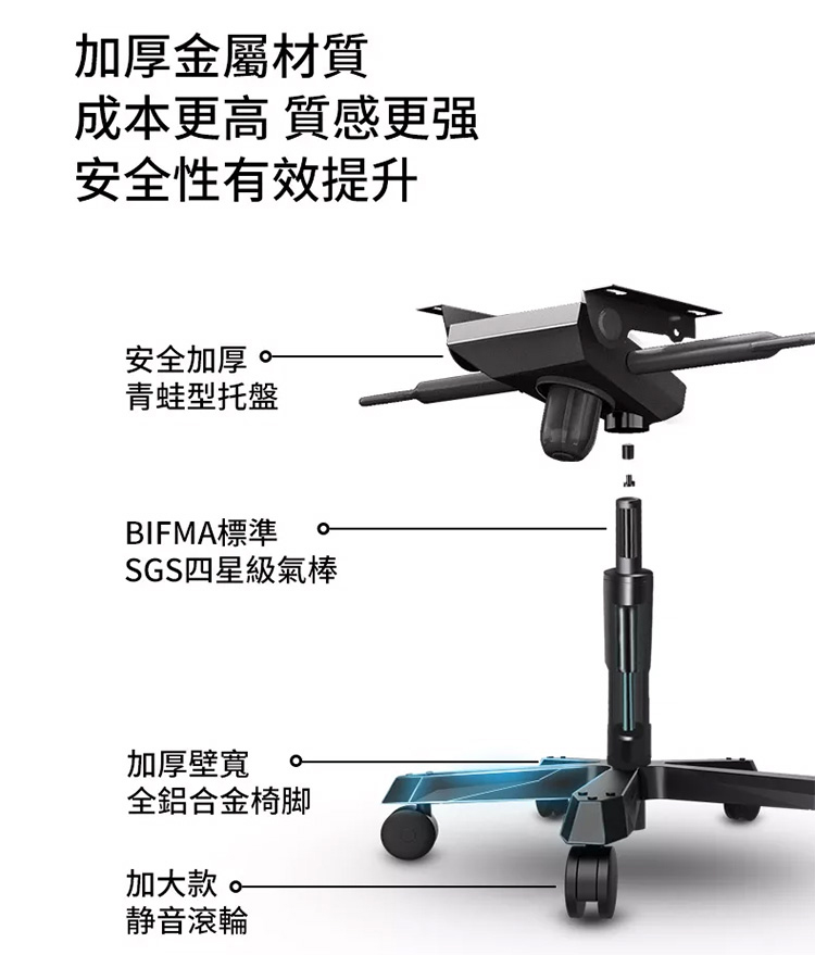 Craft工藝Series電競椅,採用直徑70CM鋁合金腳座,單腳座規格最高可以承重約140KG(本款座椅主體,最大載重為125kg)!