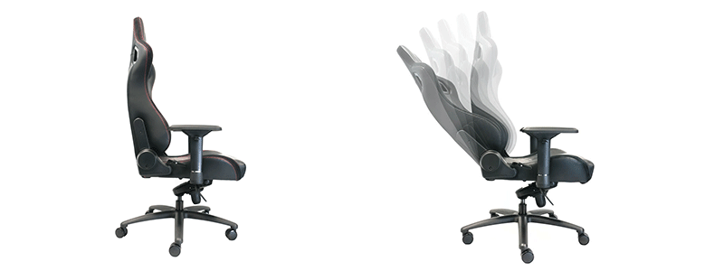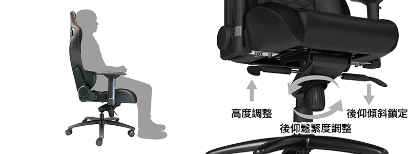 具90-135度可調節式椅背,加上座椅後仰搖擺幅度達14度。若與鎖定功能一起使用,可降至135+14=149度。
