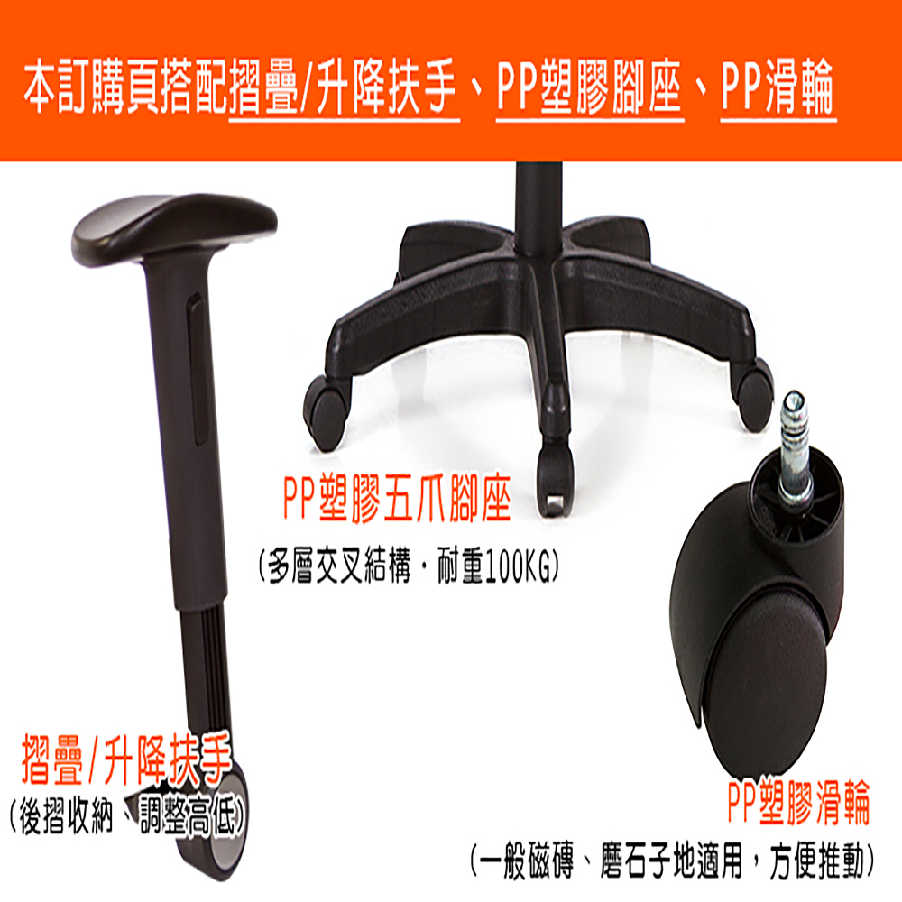 本訂購頁規格:摺疊升降扶手、塑膠腳座、PP滑輪