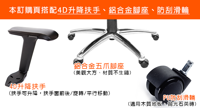 本訂購頁規格:4D升降塑鋼扶手、鋁合金腳座、PU防刮輪