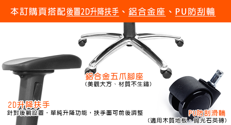 本訂購頁規格:後置2D滑面升降扶手、鋁合金腳座、PU防刮輪