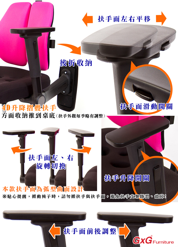 扶手面可延伸手靠的長度,倚靠增添舒適輕鬆感,可調整扶手高低,或向後折疊收納,方便推入桌下不佔空間。