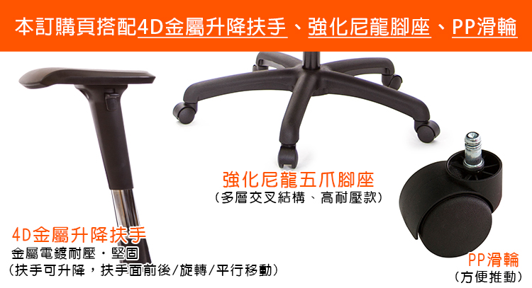 本訂購頁規格:4D金屬升降扶手、尼龍腳座、PP滑輪