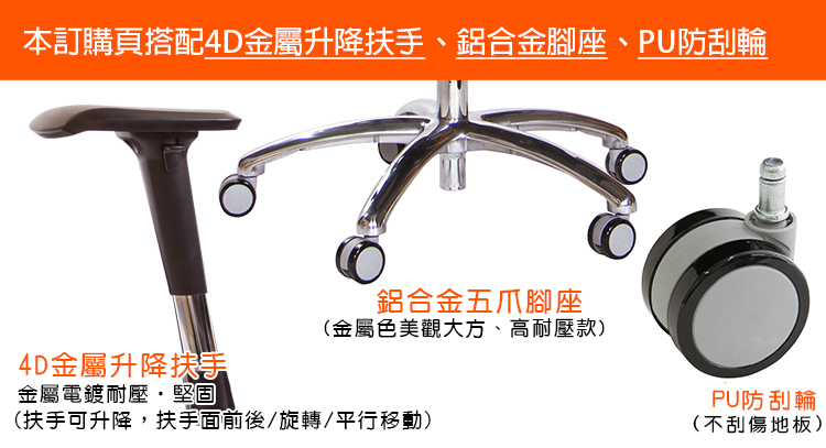 本訂購頁規格:4D金屬升降扶手、鋁合金腳座、PU防刮滑輪