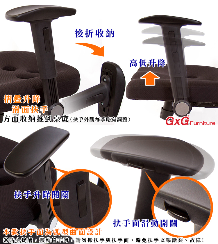 ※搬椅子時,請勿手握扶手面搬起座椅,容易導致扶手面斷裂,因多功能扶手面底部螺絲結構,無法支撐全椅重量;搬動椅子時,建議手握座墊搬起。