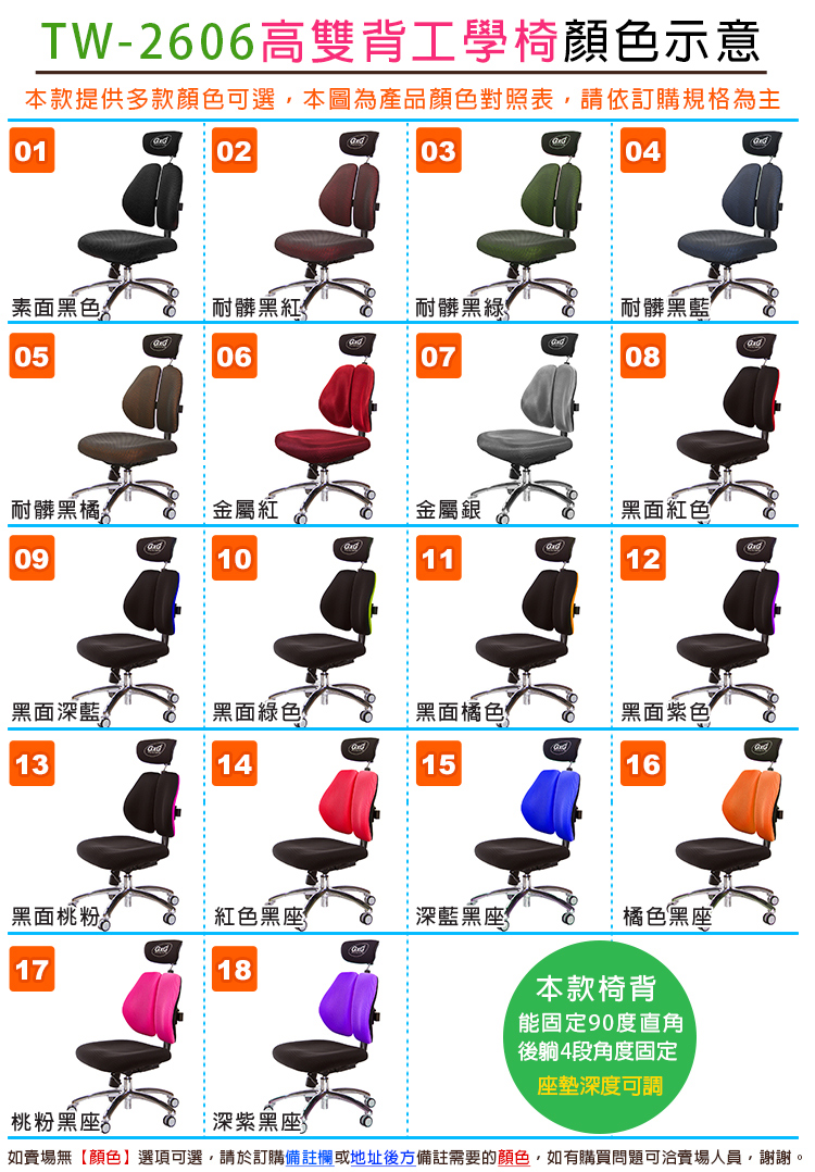 如不需要座墊深度調整,可以查看賣場型號TW-2993、TW-2995系列,這兩款型號為標準座深(座深為45CM),TW-2606型號的滑型座墊功能,主要是縮短座墊深度的功能。
