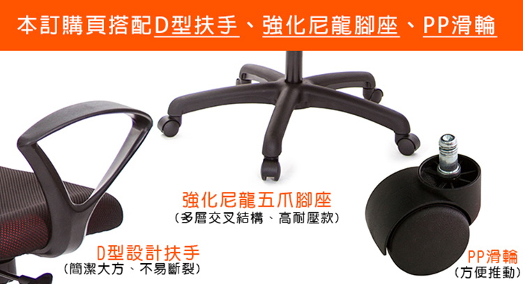 本訂購頁規格:D字固定扶手、尼龍腳座、PP滑輪