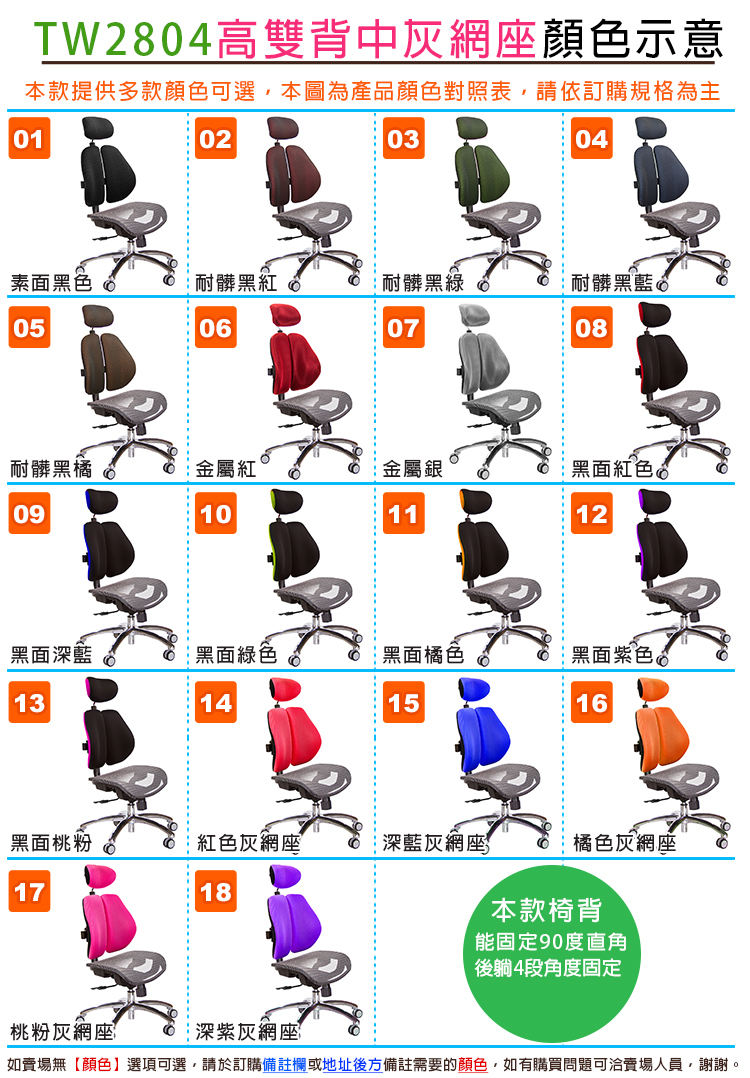 椅背可固定90度或彈力後仰式,多款造型、多功能扶手可選,
