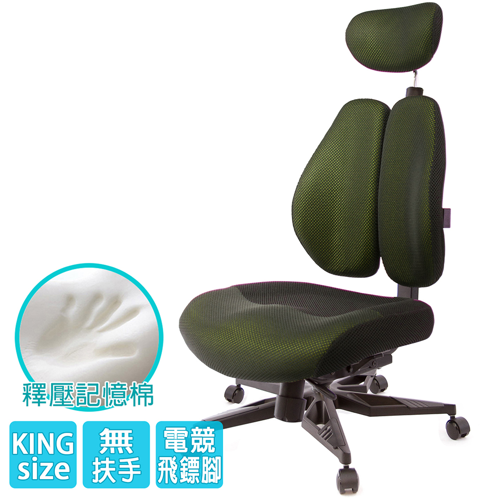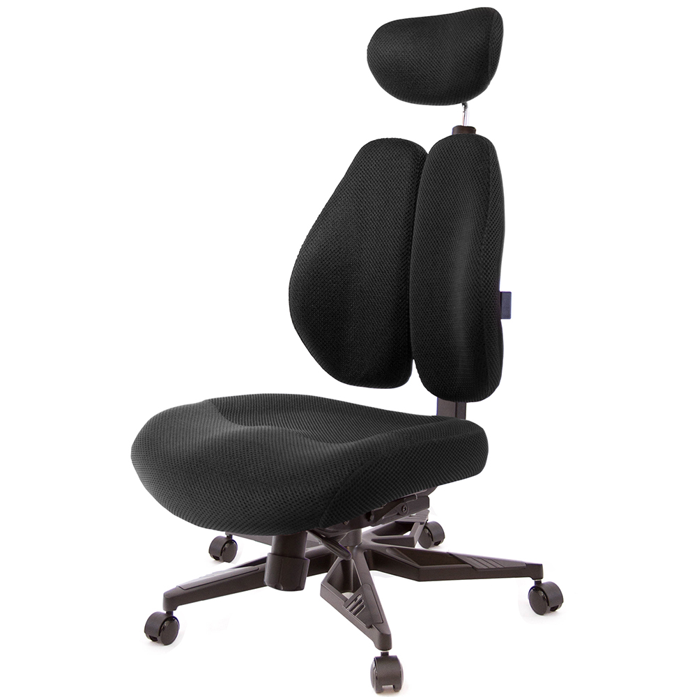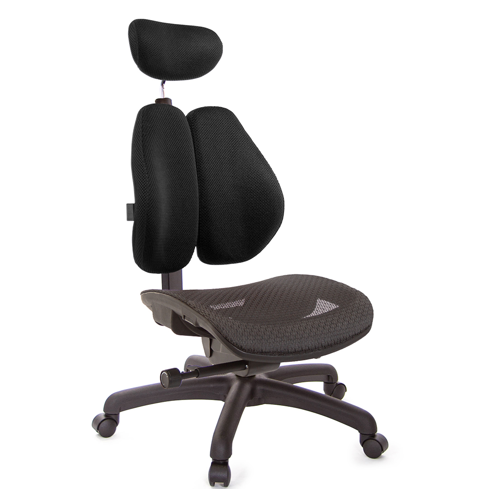 人體工學雙背設計,改善長時間座在椅子上,覺得腰部貼合度不足,有懸空或不夠沉穩的感覺,改良式的雙背背墊,除了完整包覆性外,更提供了『左右彈性』、『上下貼合』、『彈力緩衝』等特性,並有多國國際結構專利認證(台灣、德國、日本、美國、中國等),原廠專利、技術100% Made in Taiwan台灣製造。