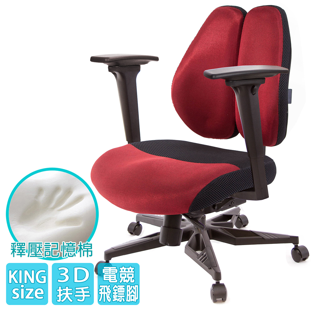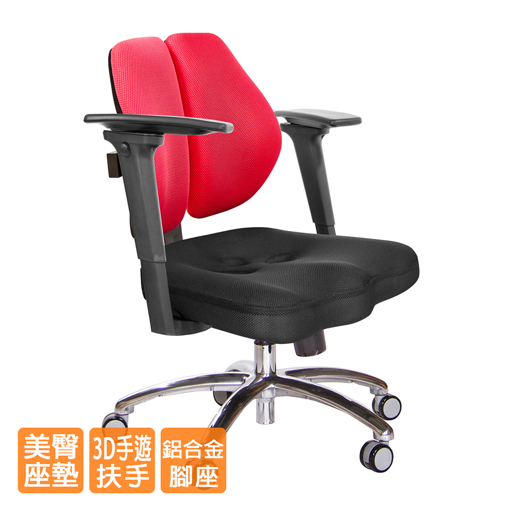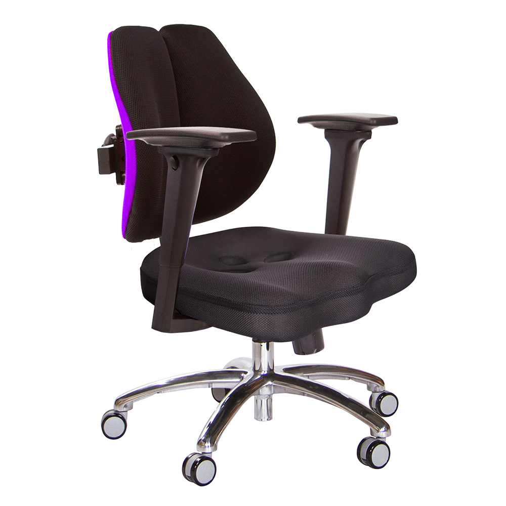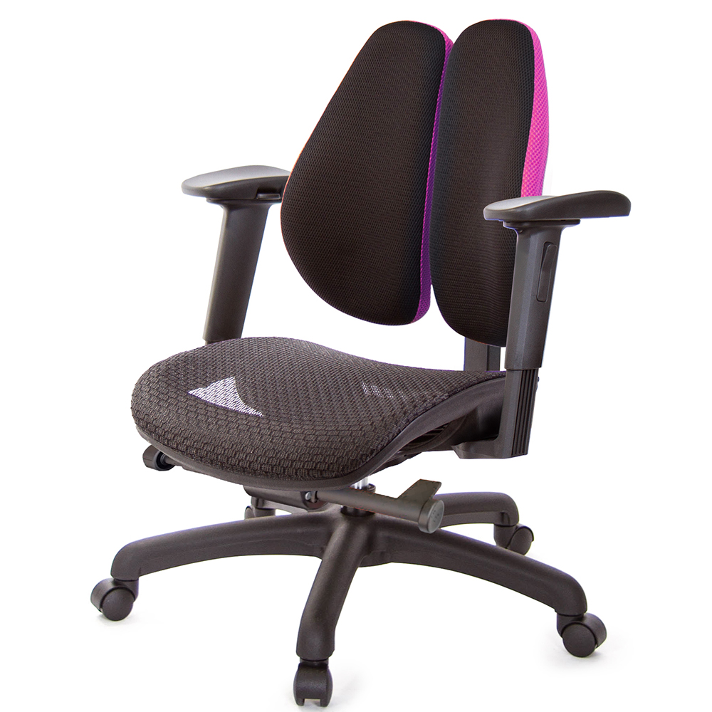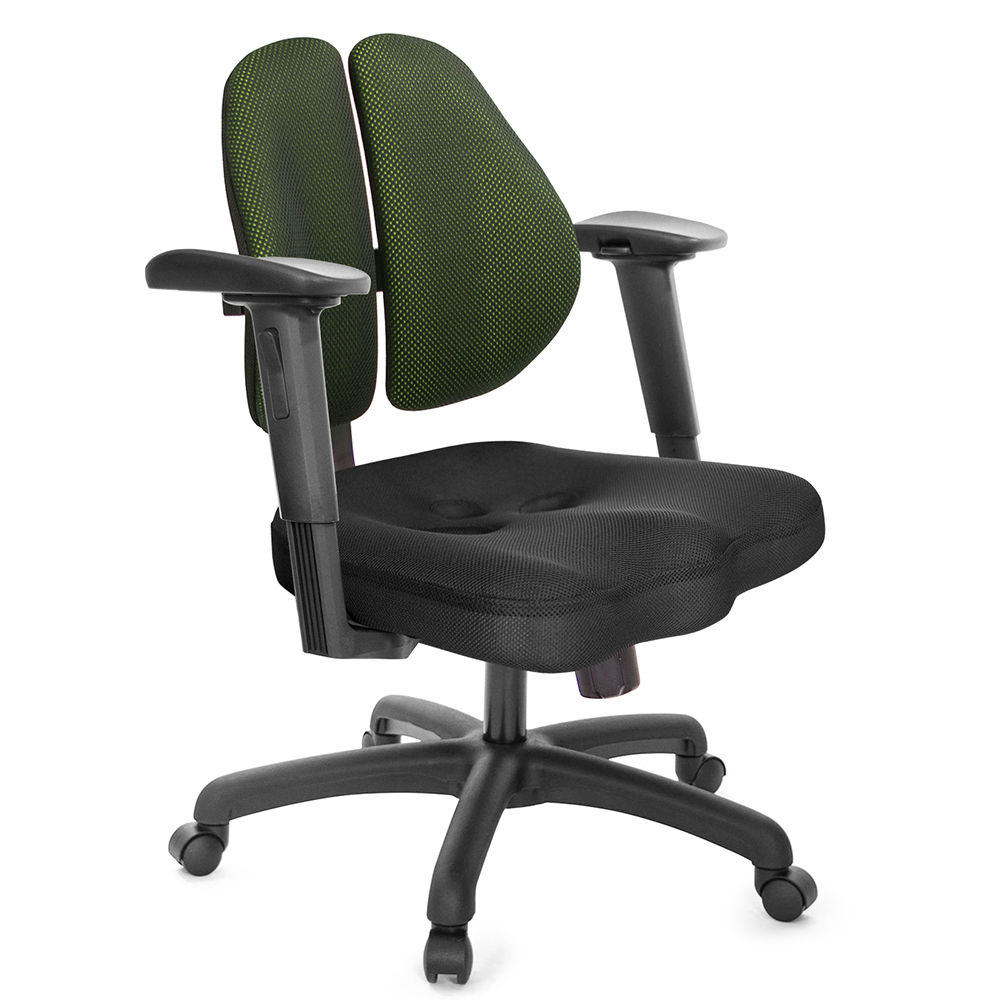 人體工學雙背設計,改善長時間座在椅子上,覺得腰部貼合度不足,有懸空或不夠沉穩的感覺,改良式的雙背背墊,除了完整包覆性外,更提供了『左右彈性』、『上下貼合』、『彈力緩衝』等特性,並有多國國際結構專利認證(台灣、德國、日本、美國、中國等),原廠專利、技術100% Made in Taiwan台灣製造。