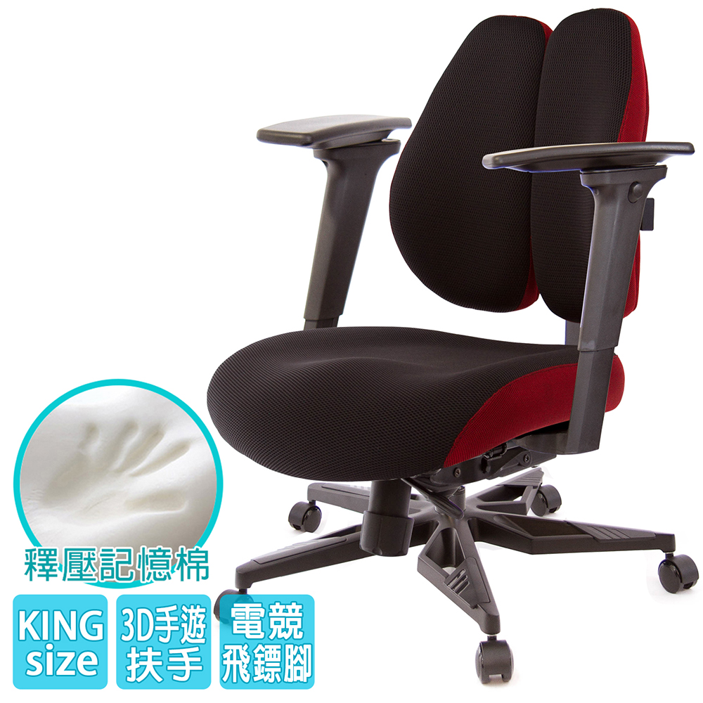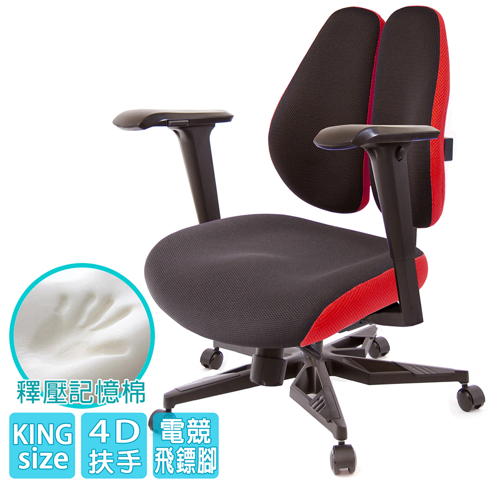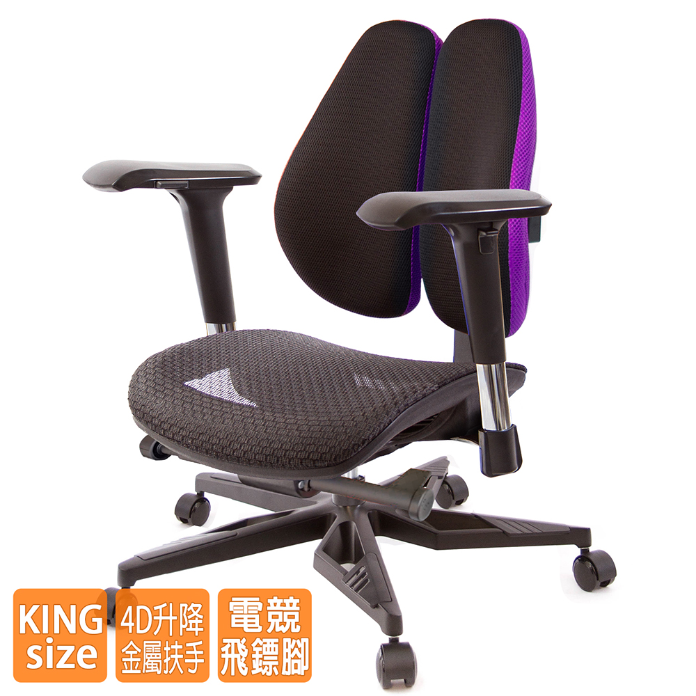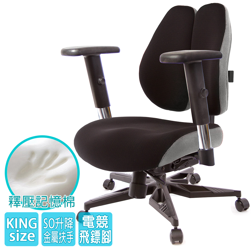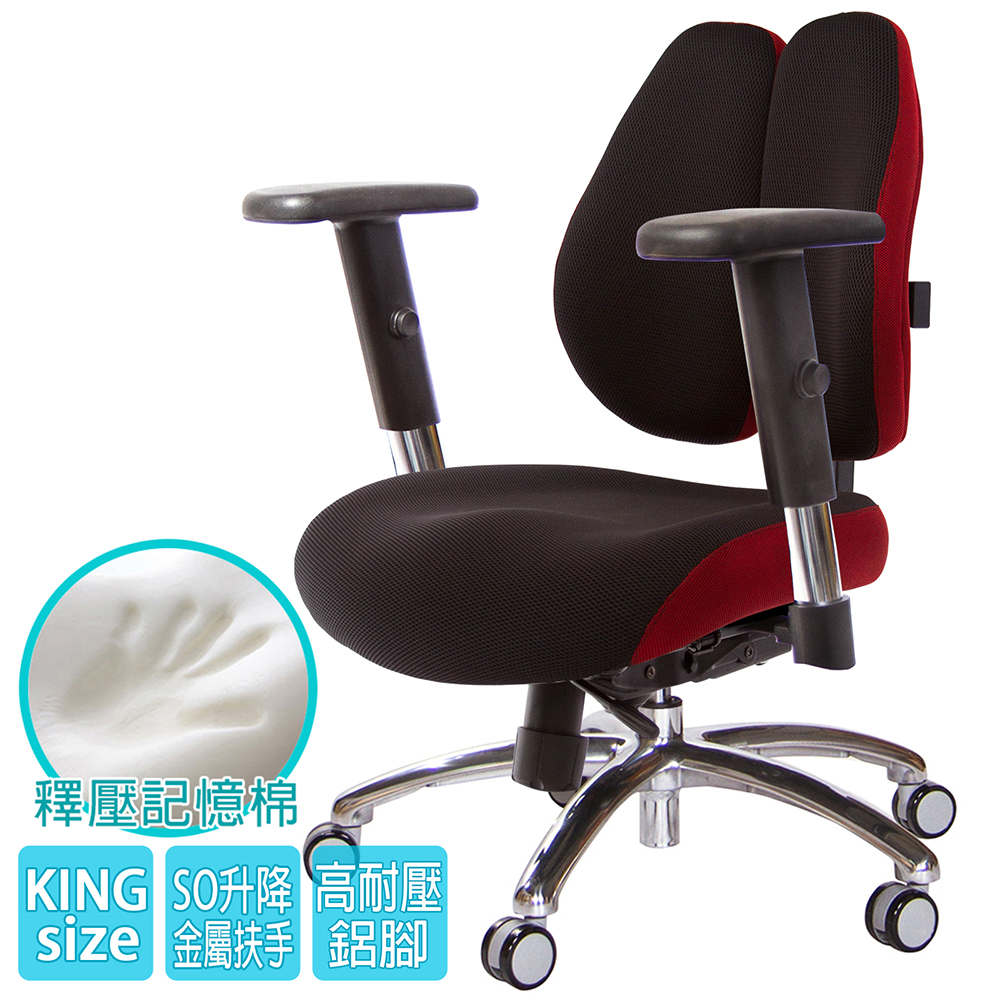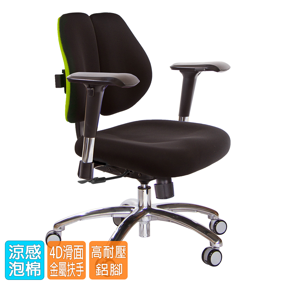 人體工學雙背設計,改善長時間座在椅子上,覺得腰部貼合度不足,有懸空或不夠沉穩的感覺,改良式的雙背背墊,除了完整包覆性外,更提供了『左右彈性』、『上下貼合』、『彈力緩衝』等特性,並有多國國際結構專利認證(台灣、德國、日本、美國、中國等),原廠專利、技術100% Made in Taiwan台灣製造。