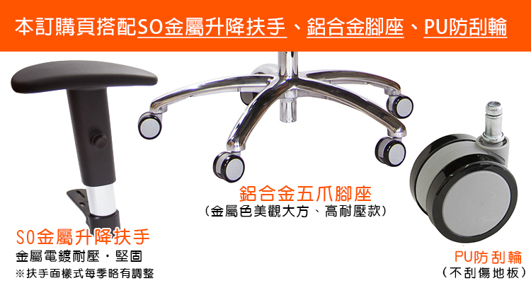 本訂購頁規格:SO金屬升降扶手、鋁合金腳座、PU防刮滑輪