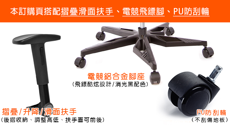 本訂購頁規格:摺疊升降/滑面扶手、電競飛鏢黑鋁腳、PU防刮滑輪