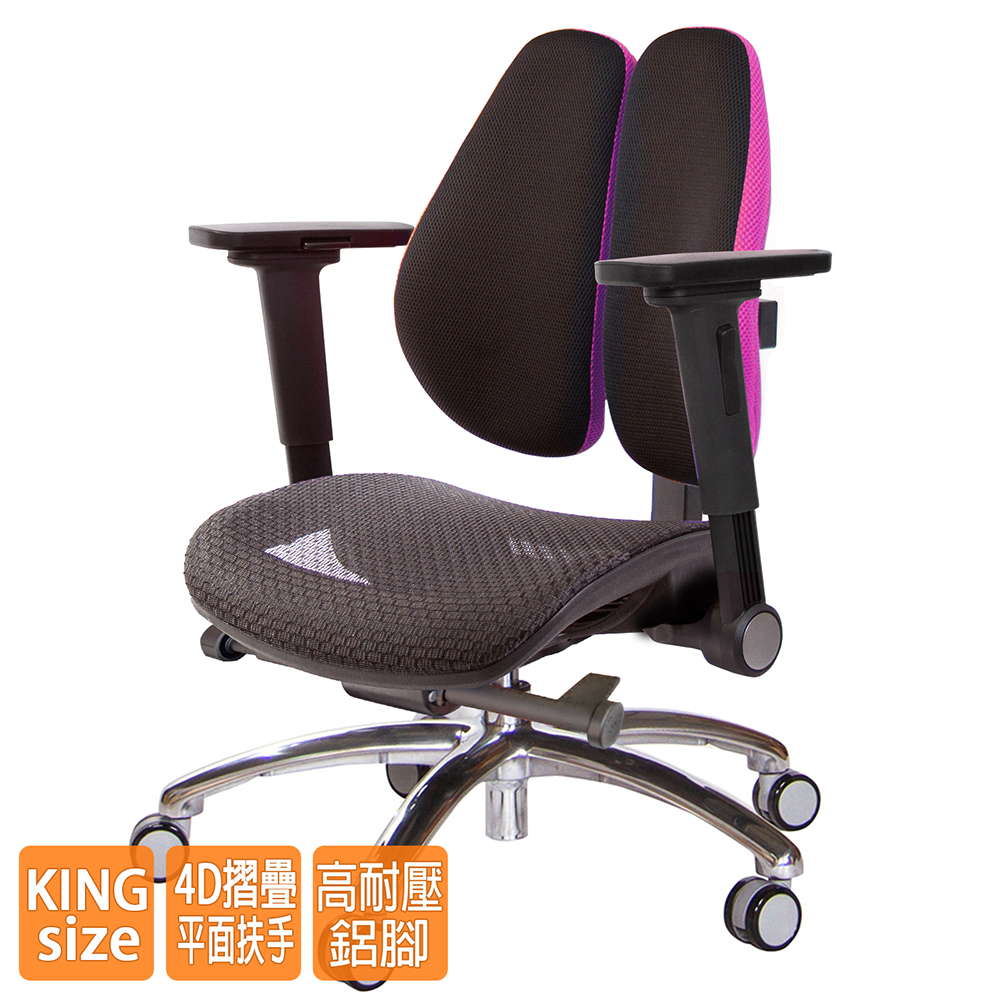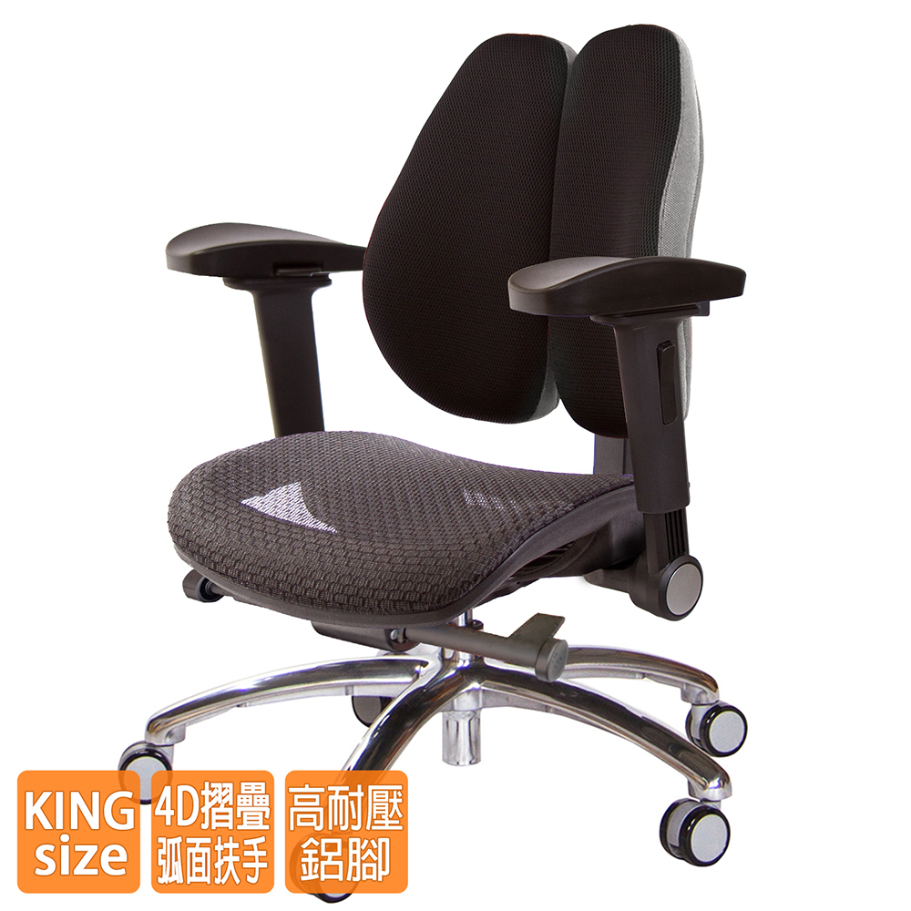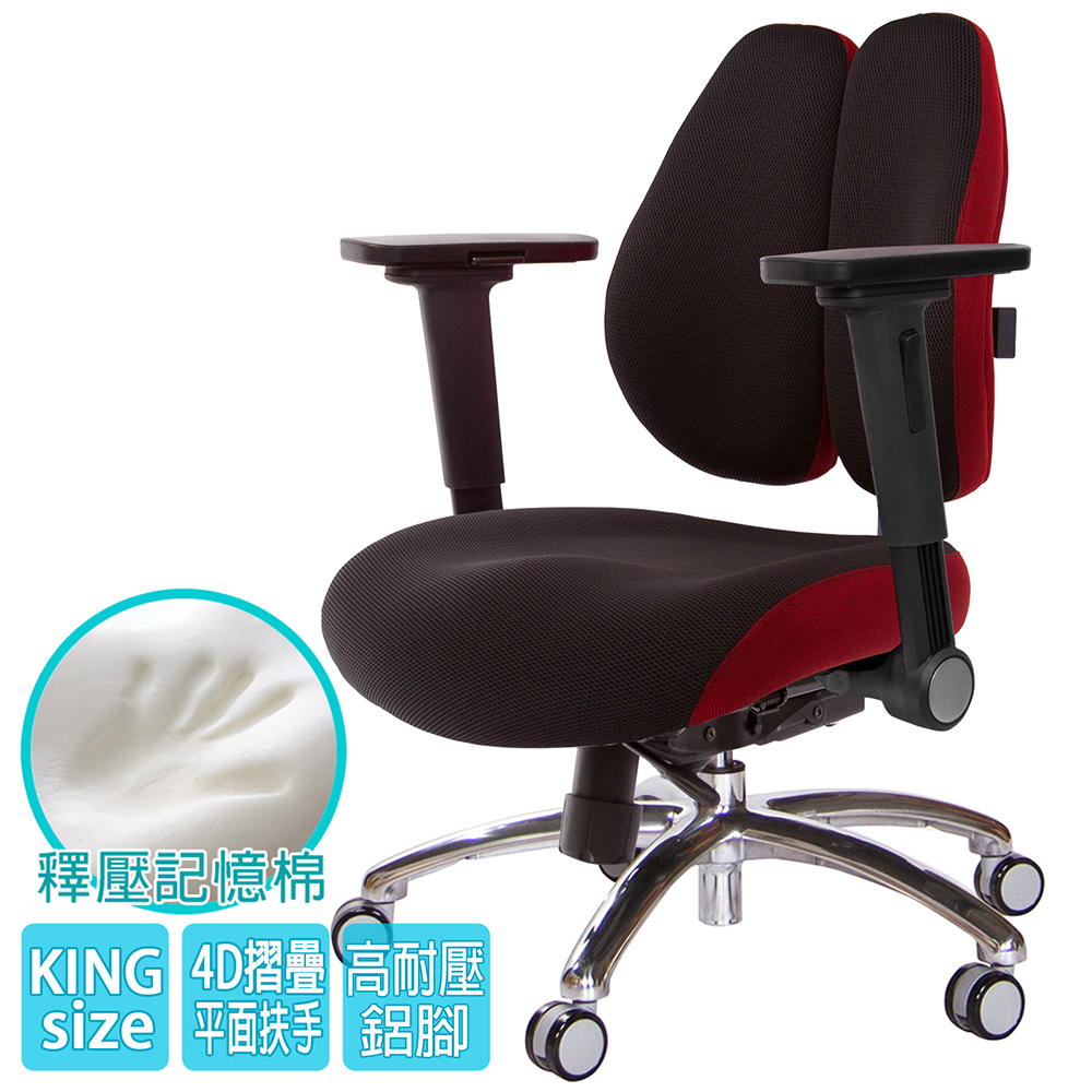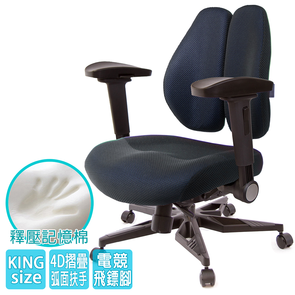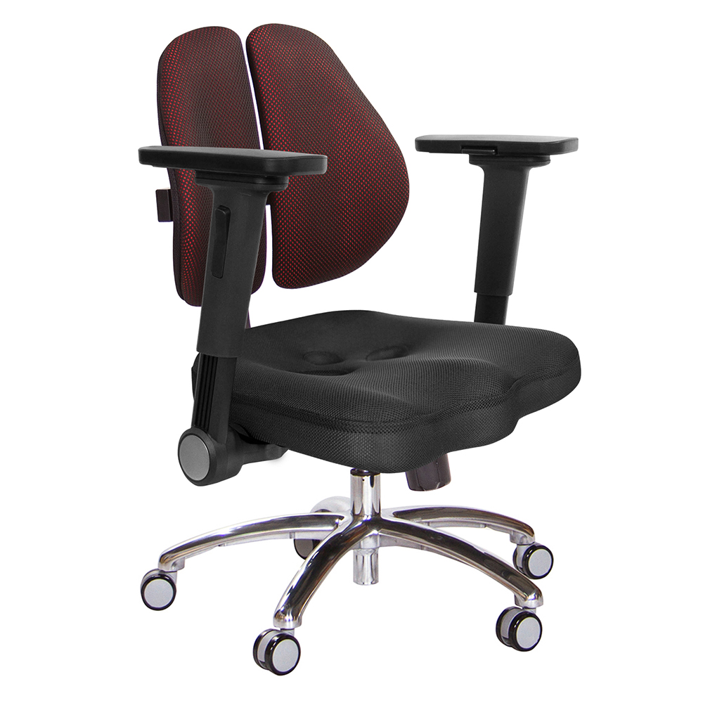 人體工學雙背設計,改善長時間座在椅子上,覺得腰部貼合度不足,有懸空或不夠沉穩的感覺,改良式的雙背背墊,除了完整包覆性外,更提供了『左右彈性』、『上下貼合』、『彈力緩衝』等特性,並有多國國際結構專利認證(台灣、德國、日本、美國、中國等),原廠專利、技術100% Made in Taiwan台灣製造。