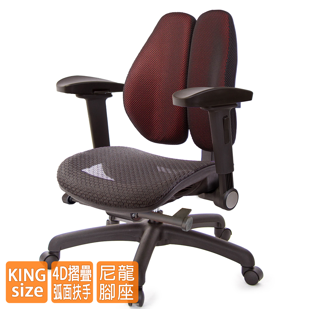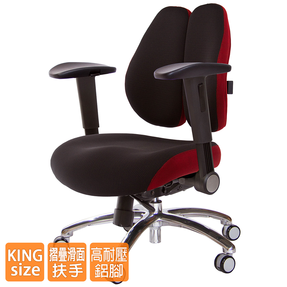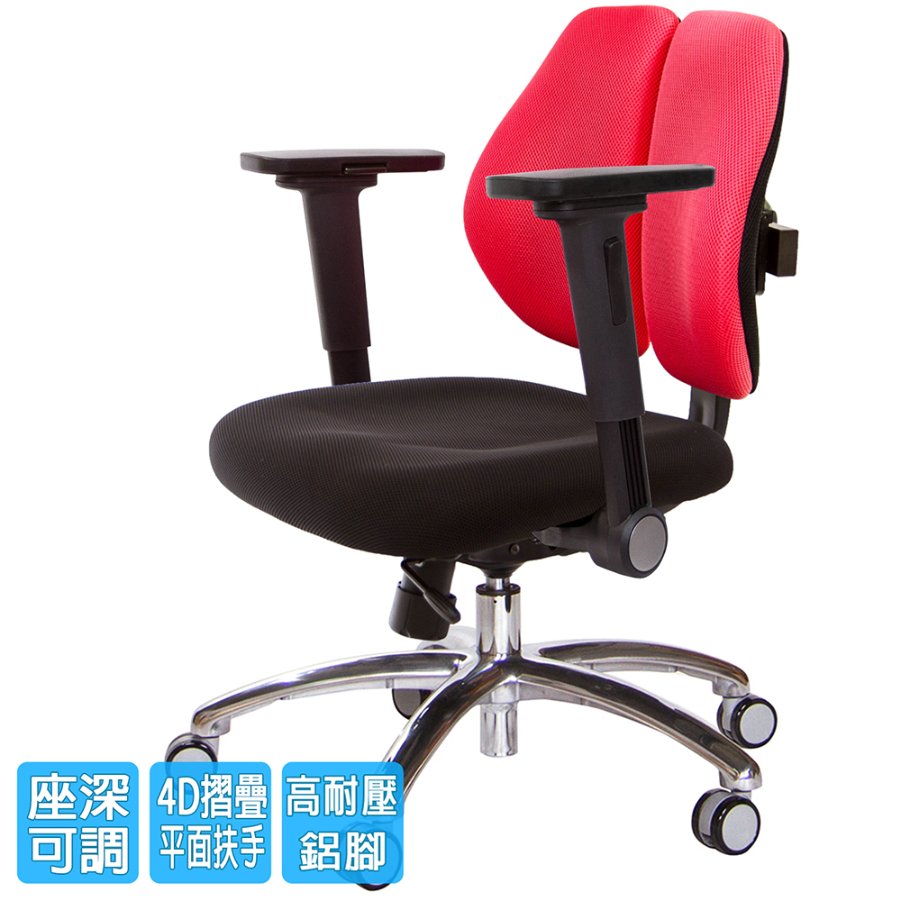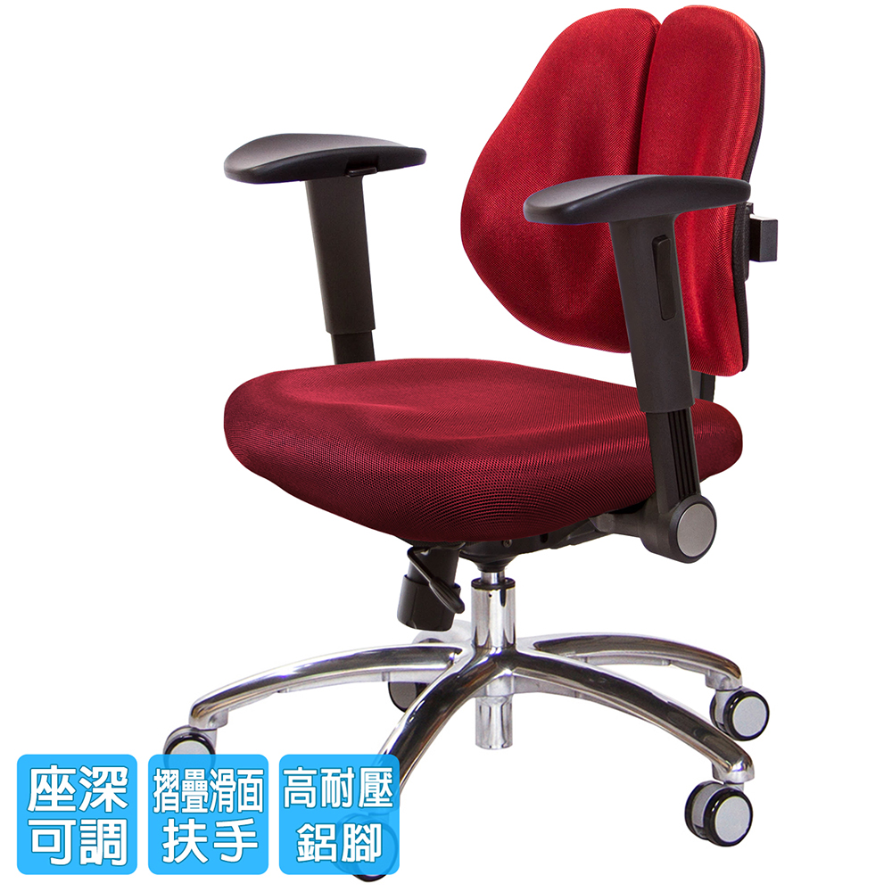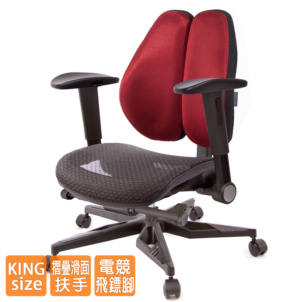 人體工學雙背設計,改善長時間座在椅子上,覺得腰部貼合度不足,有懸空或不夠沉穩的感覺,改良式的雙背背墊,除了完整包覆性外,更提供了『左右彈性』、『上下貼合』、『彈力緩衝』等特性,並有多國國際結構專利認證(台灣、德國、日本、美國、中國等),原廠專利、技術100% Made in Taiwan台灣製造。