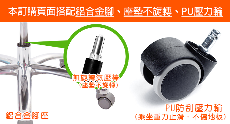 本款使用『PU壓力輪』:椅子在乘坐時,輪子會因重量下壓,止滑不易滑動;