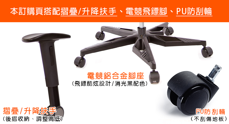 本訂購頁規格:摺疊升降扶手、電競飛鏢黑鋁腳、PU防刮滑輪
