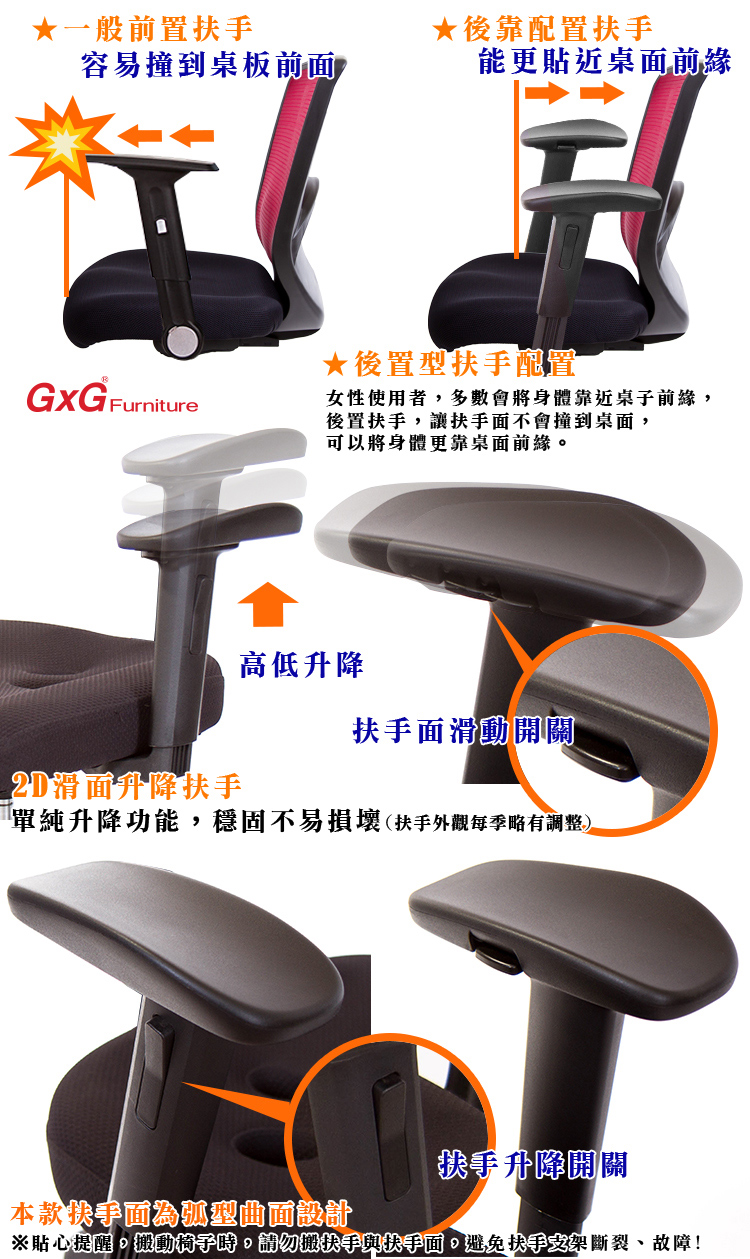 本款搭配HR-003升降扶手, 後置扶手設計,針對大多數女性使用者,喜歡將身體靠近桌面,一般扶手為前置,較容易撞到桌面,後置扶手可以避免撞到桌面,將身體更貼近桌面前源,後躺時,能讓手肘輕鬆後靠,閱讀書籍、使用平板手機,更輕鬆舒適。