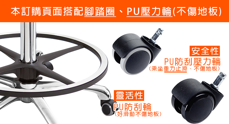 『PU壓力輪』:椅子承重時,輪面會因重量下壓固定不滑動;椅面沒有重量時,保有『一般滑輪』作用方便滑動,不傷地板。