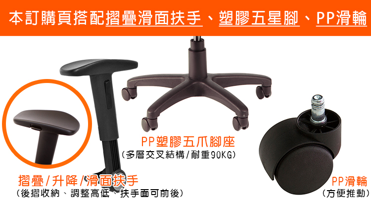 本訂購頁規格:2D滑面摺疊扶手、塑膠腳座、PP輪
