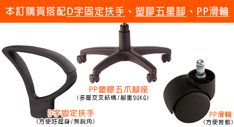 本訂購頁規格:D字固定扶手、塑膠腳座、PP輪