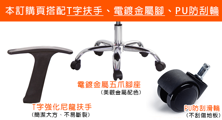 本訂購頁規格:T字固定扶手、電鍍金屬腳、PU防刮輪