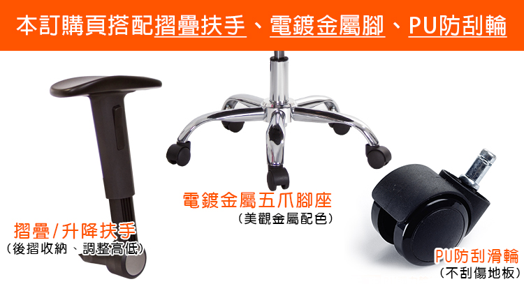 本訂購頁規格:摺疊升降扶手、電鍍金屬腳、PU防刮輪