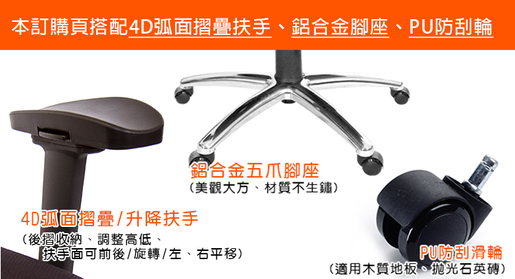 本訂購頁規格:4D弧面升降折疊扶手、鋁合金腳座、PU防刮輪