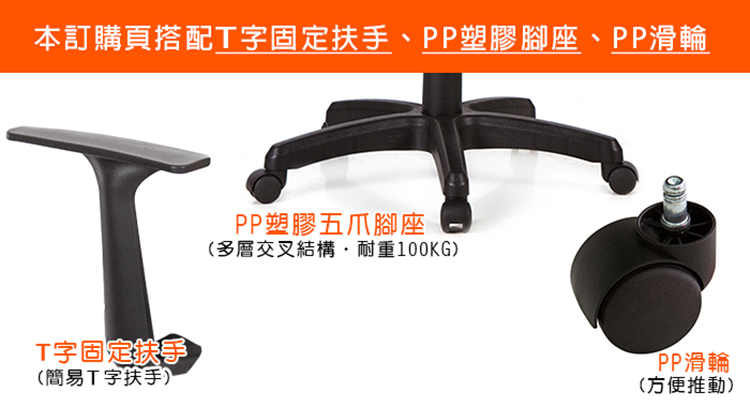 本訂購頁規格:T字固定扶手、強化PP塑膠座、PP滑輪