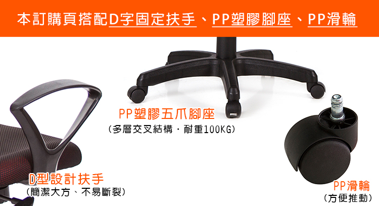 本訂購頁規格:D字固定扶手、強化PP塑膠座、PP滑輪