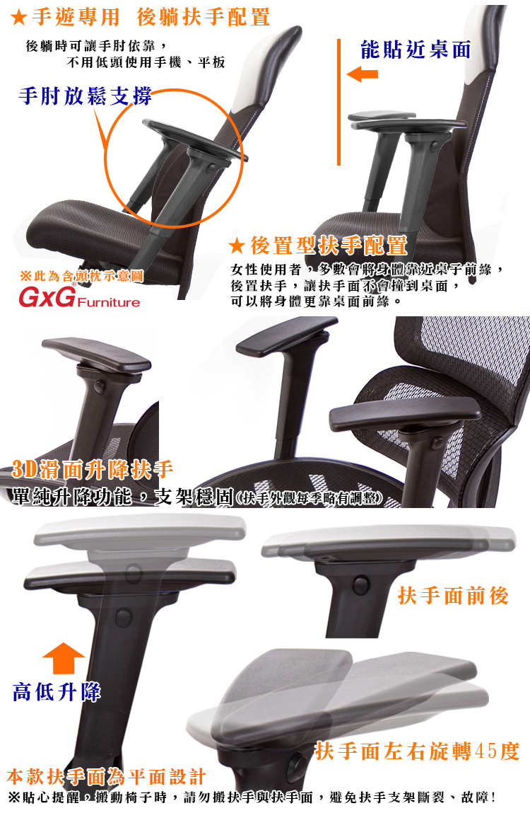 ※搬椅子時,請勿手握扶手面搬起座椅,容易導致扶手面斷裂,因多功能扶手面底部螺絲結構,無法支撐全椅重量;搬動椅子時,建議手握座墊搬起。
