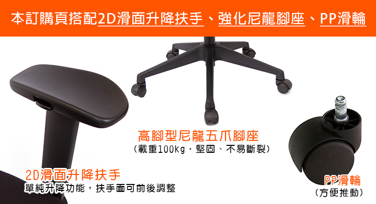 本訂購頁規格:2D滑面升降扶手、尼龍高腳座、PP滑輪