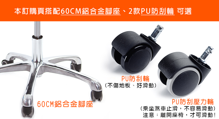 『PU壓力輪』:椅子承重時,輪面會因重量下壓固定不滑動;椅面沒有重量時,保有『一般滑輪』作用方便滑動,不傷地板。