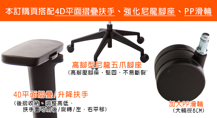 本訂購頁規格:4D平面升降折疊扶手、尼龍高腳座、PP滑輪