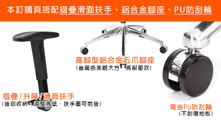 本訂購頁規格:摺疊升降/滑面扶手、鋁合金高腳座、PU防刮輪