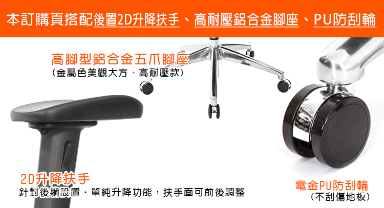 本訂購頁規格:後置2D滑面升降扶手、鋁合金腳座、PU防刮輪