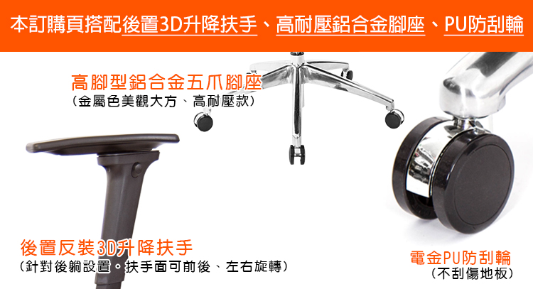 本訂購頁規格:後置3D升降扶手、鋁合金高腳座、PU防刮輪