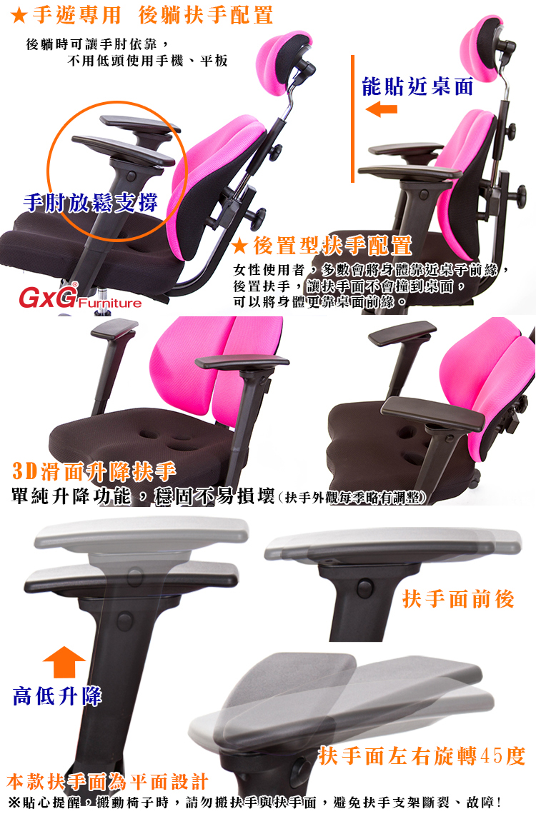 本款HR-809扶手, 後置扶手設計,針對大多數女性使用者,喜歡將身體靠近桌面,一般扶手為前置,較容易撞到桌面,後置扶手可以避免撞到桌面,將身體更貼近桌面前源,後躺時,能讓手肘輕鬆後靠,閱讀書籍、使用平板手機,更輕鬆舒適。