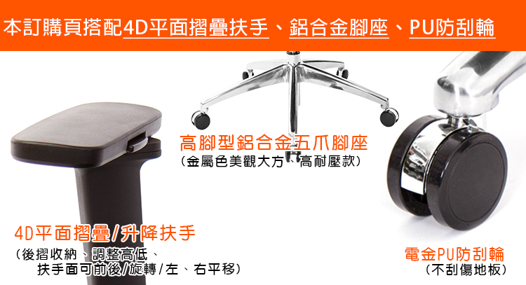 本訂購頁規格:4D平面升降折疊扶手、鋁合金高腳座、PU防刮輪