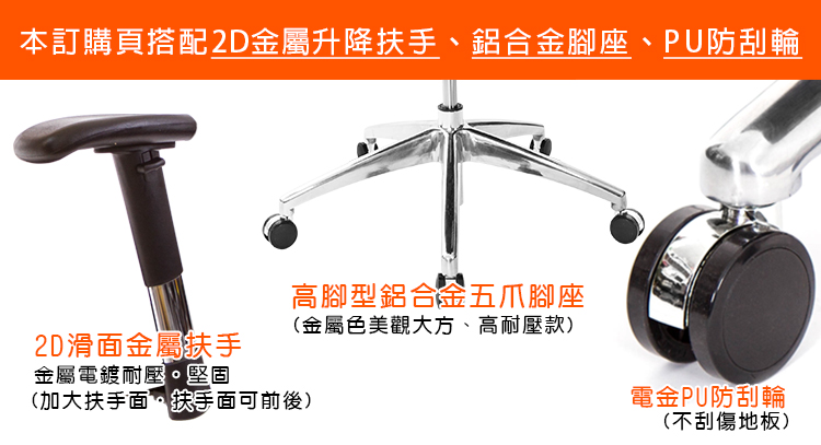 本訂購頁規格:2D滑面金屬扶手、鋁合金腳座、PU防刮輪