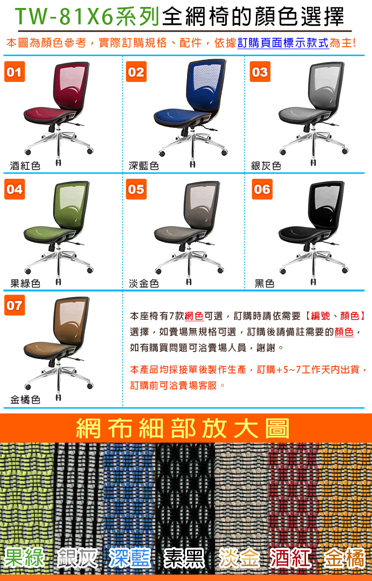 TW-81X6全網電腦椅,採用台灣製造SGS認證特網,使用尼龍纖維絲,不吸水、好清潔,更提供20種款式規格。