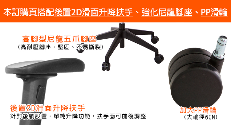本訂購頁規格:後置2D滑面升降扶手、尼龍腳座、PP尼龍滑輪