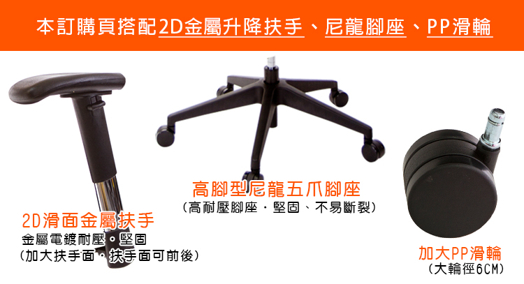 本訂購頁規格:2D滑面金屬扶手、尼龍高腳座、PP滑輪