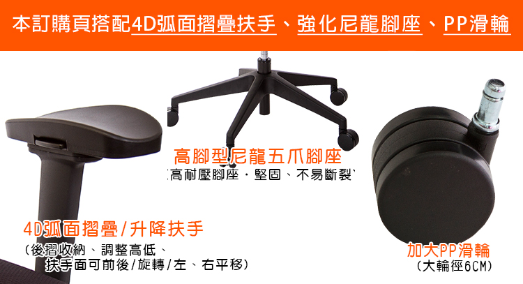 本訂購頁規格:4D弧面升降折疊扶手、尼龍高腳座、PP滑輪