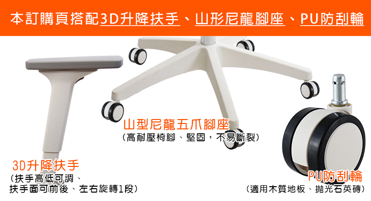 本訂購頁規格:無頭枕、3D升降扶手、尼龍高腳座、PU防刮輪
