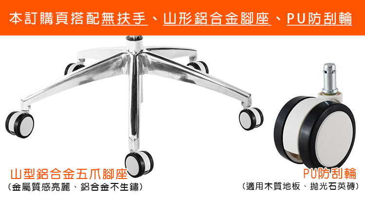 本訂購頁規格:無頭枕、無扶手、山型鋁合金腳、PU防刮輪