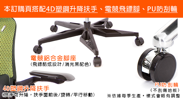 本訂購頁規格:4D塑鋼升降扶手、電競飛鏢鋁合金腳座、PU防刮滑輪
