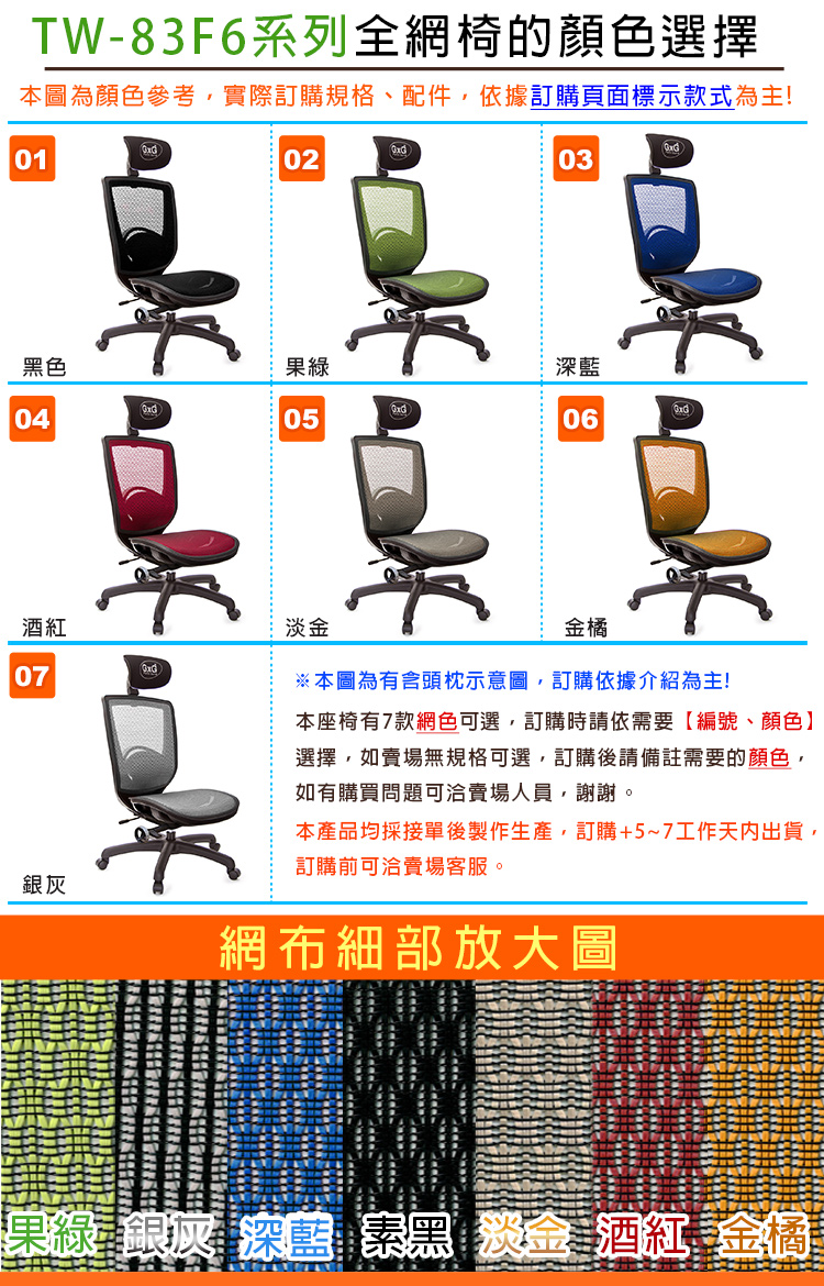 TW-83F6全網電腦椅,採用台灣製造SGS認證特網,使用尼龍纖維絲,不吸水、好清潔,更提供20種款式規格。