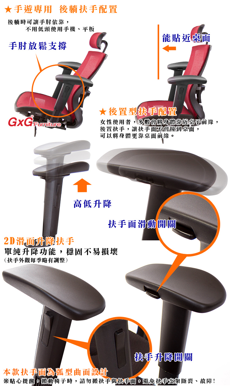 本款搭配HR-003升降扶手, 後置扶手設計,針對大多數女性使用者,喜歡將身體靠近桌面,一般扶手為前置,較容易撞到桌面,後置扶手可以避免撞到桌面,將身體更貼近桌面前源,後躺時,能讓手肘輕鬆後靠,閱讀書籍、使用平板手機,更輕鬆舒適。