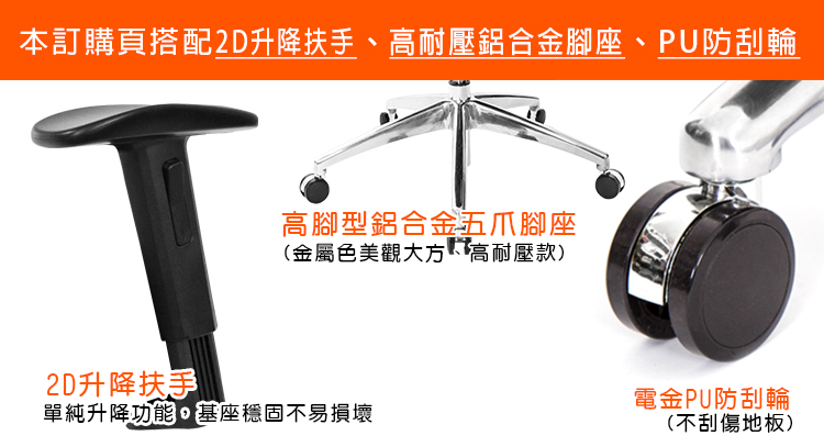 本訂購頁規格:2D升降扶手、鋁合金腳座、PU防刮輪